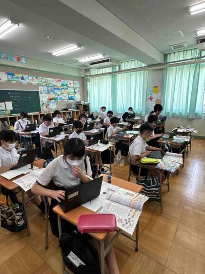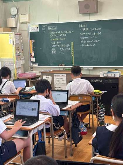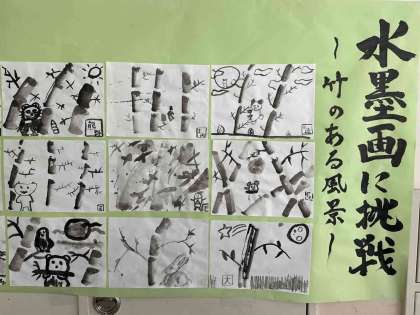 税金についてタブレットを効果的に活用しながら学習を進めています。また、教室前には素敵な水墨画が掲示されていました。