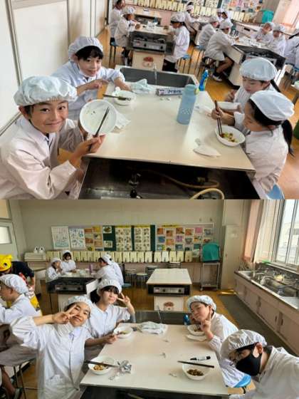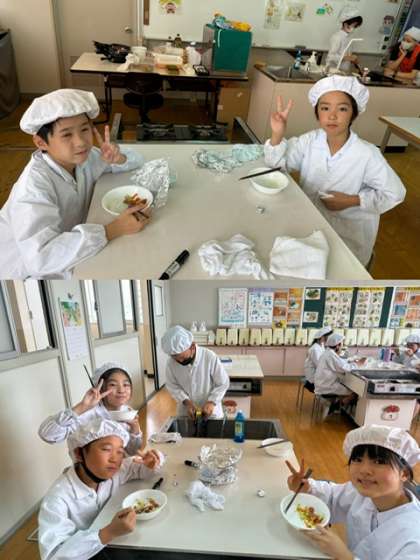 いただきますをし、班で美味しくいただきました。1人ずつ切り方が違う野菜炒めは個性が出ていて、とても美味しそうでした。