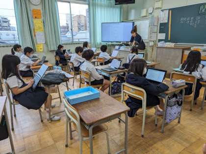 パソコンで自分が放送してもらいたいと思う曲をアンケートで答えます。パソコンの扱い方も慣れ、スムーズに選ぶことができています。