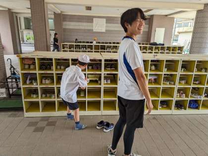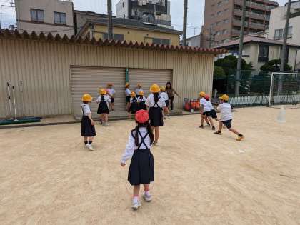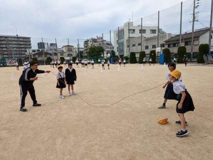 大縄をしたり、だるまさんが転んだをしたり、楽しく遊んでいます。雨が続いたので、外で遊ぶ人が多いです。