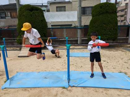 柏里小学校に、プチ鉄棒ブームがやってきています。後方片ひざかけ回転の練習を頑張っています。3回転連続でできる人もいました。さあ、みんなもレッツ、鉄棒!