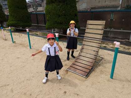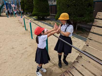 1年生の鉄棒に6年生がサポートして、補助板ありで逆上がりに挑戦し、できるようになりました。うれしくてハイタッチ!ありがとう6年生!頑張った1年生!