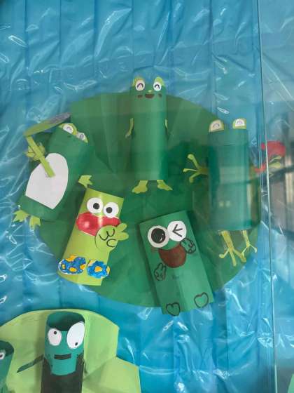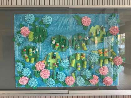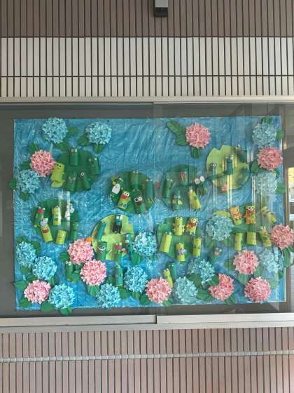 6月は梅雨になるので、玄関掲示は可愛い紫陽花とカエルさんが登場です。ご来校の際にご覧ください。