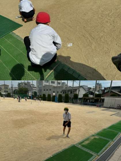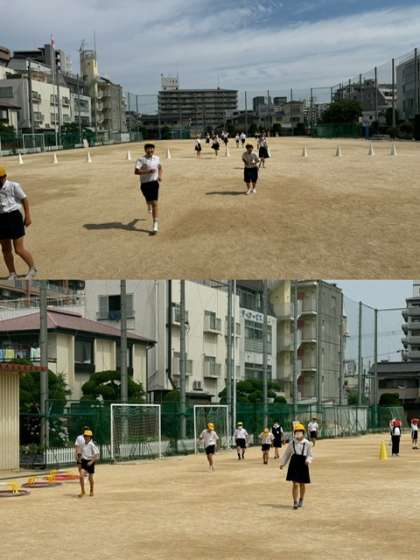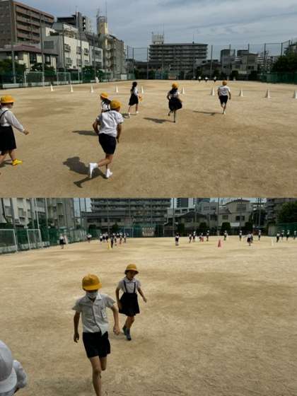 まずは、運動場でくつ下のまま走ったり、土をかけたりして、くつ下を汚していきました。