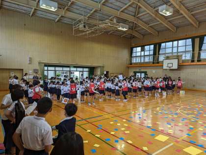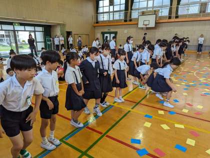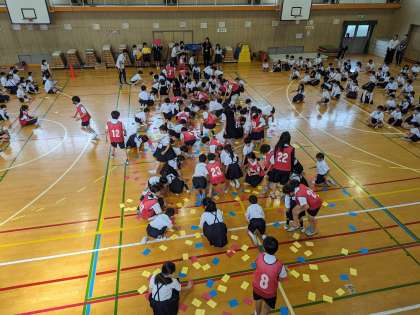 学年を分けて、たてわり班対抗で当たりを見つけるゲームです。集会委員会、用意が大変だったと思います。ありがとうございました!