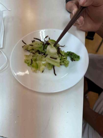 今日は調理実習でキャベツの和え物を作里ました。塩昆布とキャベツを混ぜるだけなんですが、これがおいしい!!家でもやってみようと言っていました。第二部はご家庭での調理実習お願いします。