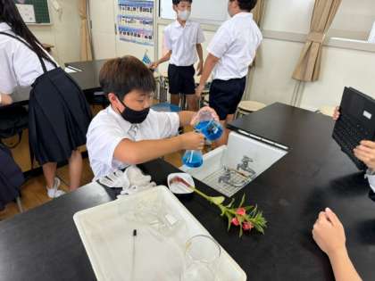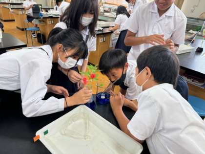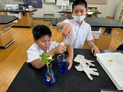 根から吸い上げた水はからだのどこを通っていくのかを調べる実験をしました。班で作った色水にホウセンカを入れ、変化を見ていきます。