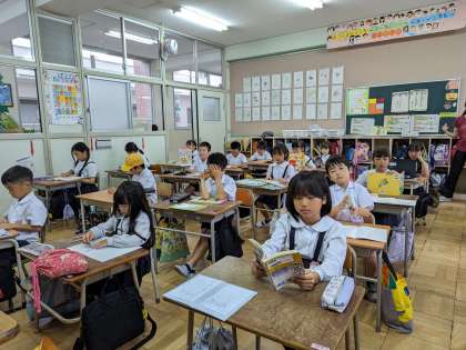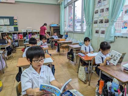 朝の用意をすばやくして、読書をしています。グーペタピンの良い姿勢(机とお腹のあいだグー・足の裏ゆかにペタ・椅子に座った背中をピン)を意識して読みましょう。