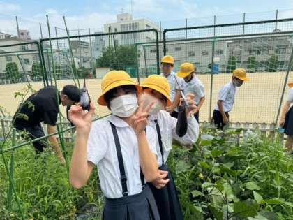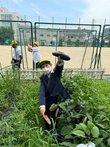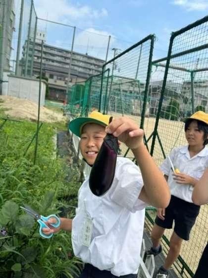 春に学習園に植えたナスが成長し、食べ頃になったので収穫しました。毎日欠かさずお水をあげてくれていたので、とても立派なナスが育ちました。