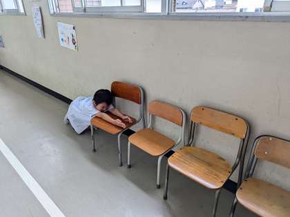 椅子が丁寧に並んであるか、前へならえをして椅子を整えています。