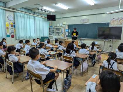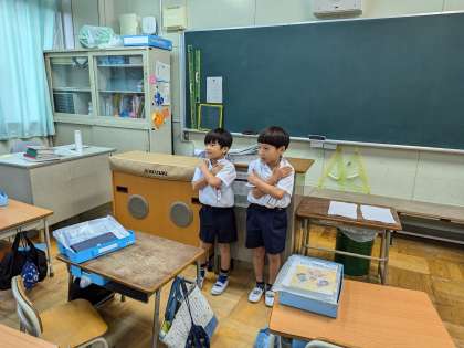 雨がポツポツ降り出しましたが、1年生の元気なあいさつ、元気な返事で朝がスタートしています。