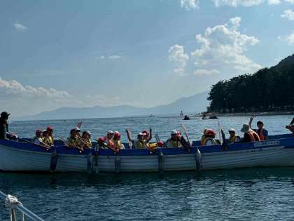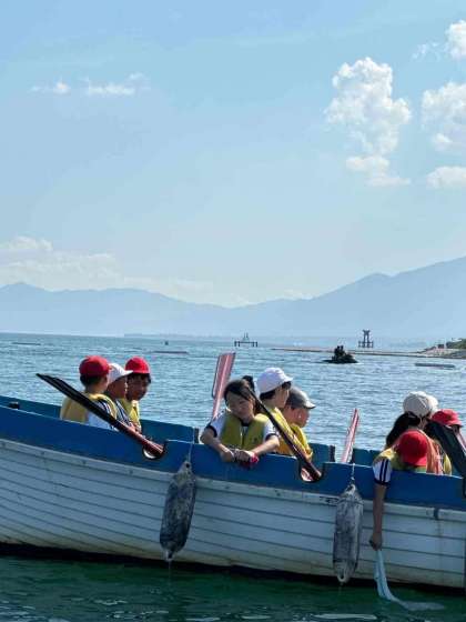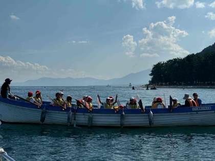 あまりの暑さと風で白髭神社の鳥居に近づけず途中で引き返しましたが、子どもたちはやりきった感じでいっぱいです。