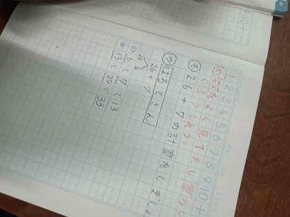 暗算するには少し難しい足し算を工夫して計算する学習です。26+7を20と6に分けてから6+7=13として、20+13=33というように分けて考えると計算しやすいという学習でした。初めは???とわからなかった児童も少しずつ工夫して考えることができるようになってきました。