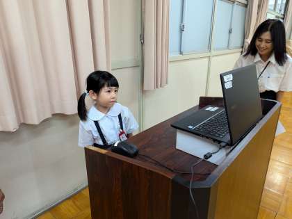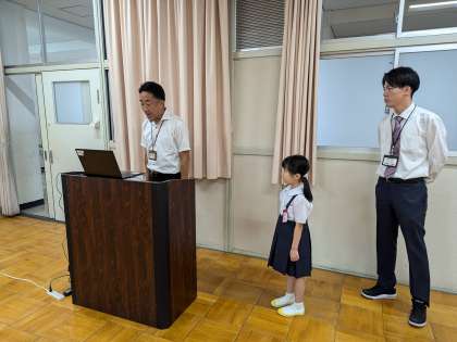 新しく先生、友達が増えました。行事がたくさんの2学期をみんなで協力していきましょう。みんなで柏里小学校100周年を盛り上げていきましょう。クイズです。先生の名前は何でしょう。答えは直接伝えてくださいね。
