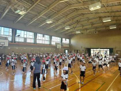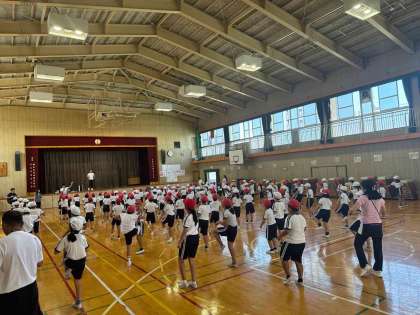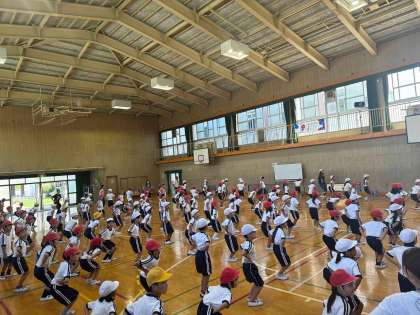 講堂に集まって足速ダンスの練習を行いました。一つ一つの動きを教えてもらった後、学年ごとに発表しました。ニコニコ楽しそうにダンスできました。