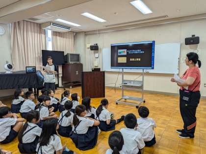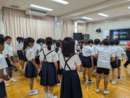 社会見学の事前指導を聞いています。津波、高潮について正しい知識を得ること、その対策についても真剣に考えるきっかけになりました。実際に施設に行き、体験するのが楽しみです。