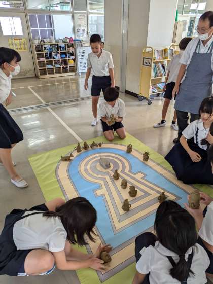 前方後円墳の周りに、作品を装飾しています。作り方を教えていただき、丁寧に作ることができました。