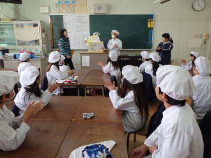 交流給食で高学年のリーダーから正しい手洗いの仕方を教えてもらって実践しました。