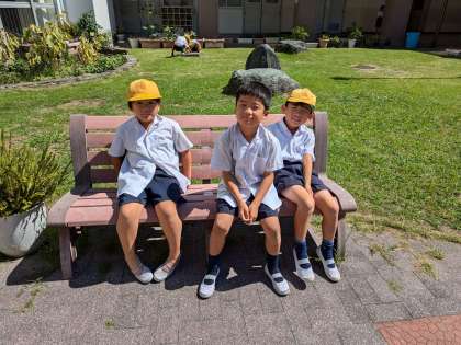 中庭のベンチで楽しく過ごしています。マインクラフトごっこで盛り上がっています。想像の世界が広がり、すごく楽しそうです。