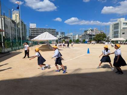 外で元気よく遊んでいます。学級遊びではルールを守って楽しく遊べるように考えています。