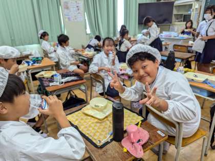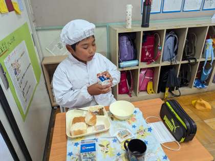 よく噛んでたくさん食べています。おかわりしたパンも、全部食べました。明日の運動会本番に向けて、体力をしっかりつけましょう。