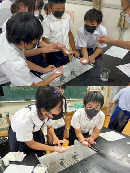 手のひらに重曹とクエン酸を混ぜたものに水を垂らすとシュワシュワ泡が発生し、冷たくなることに驚いていました。