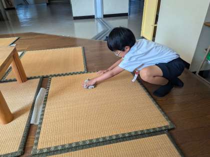 ふれあい広場の畳を丁寧に雑巾で汚れを落としています。目に沿って拭くことで丁寧に汚れが落ちます。1年生の掃除も立派なものです。