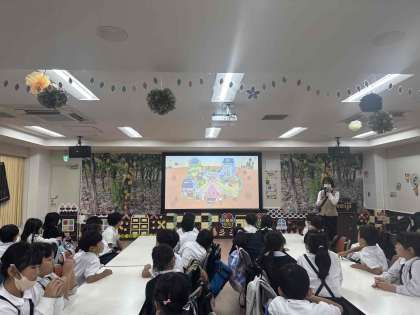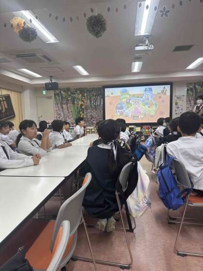 工場見学を終えて記念撮影をして、室内で映像を見たり質問をしたりしています。