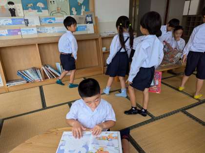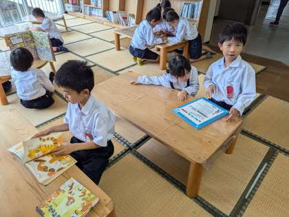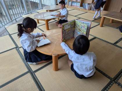 雨が降っていますのでふれあい広場の本を読むことができます。西淀川図書館から借りてきた本もそこで読むことができます。