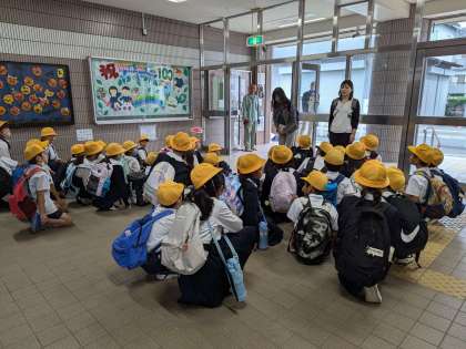 玄関前で社会見学に必要な約束ごとの確認をしています。