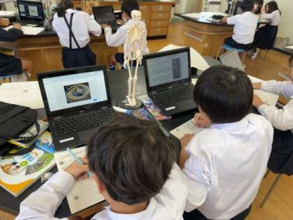 ヒトと動物のからだのつくりと仕組みについて学習しました。自分の好きな動物を選び、パソコンを使い調べました。骨と筋肉に注目してまとめていました。