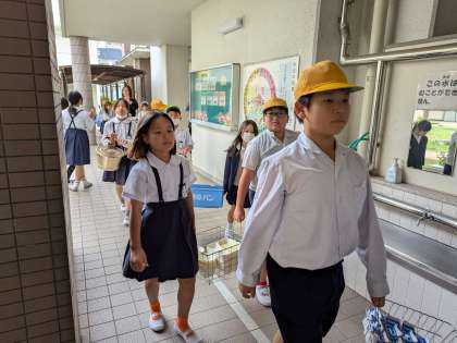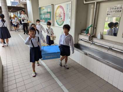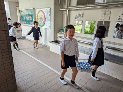 食べ終わって、給食室まで安全に運搬します。