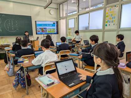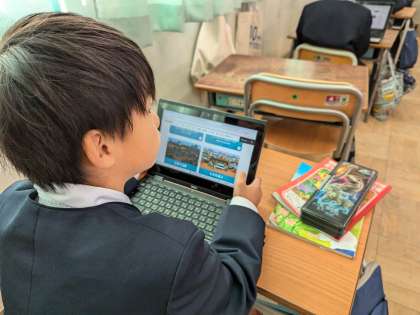 いろいろなふねの学習で、はたらく車についてパソコンを使って調べ学習をしています。