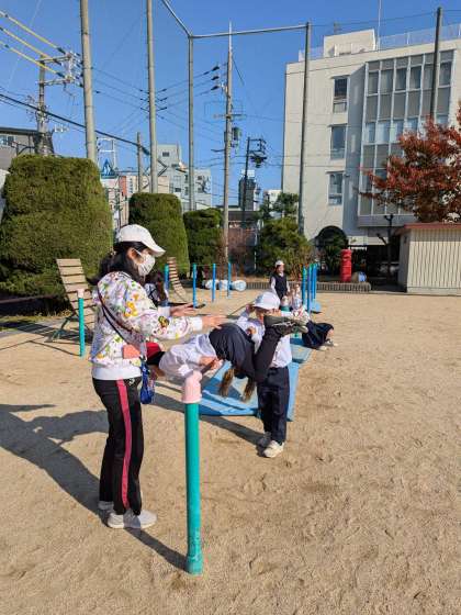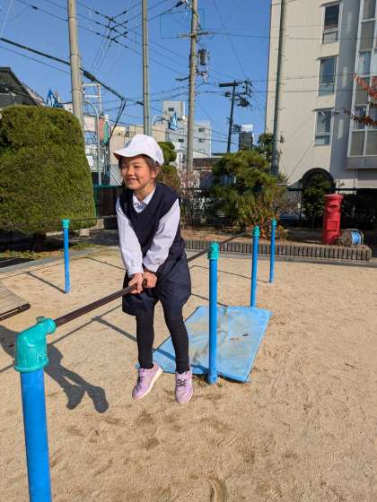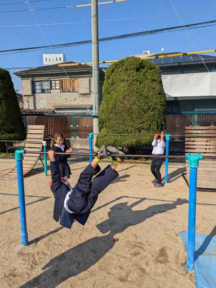 1年生の鉄棒遊びに密着です。体育で学習したことを遊び時間にも活用しています。