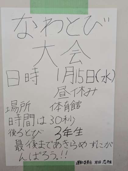 来週の4日間は、なわとび大会を開催します。運動委員会が中心となって跳んだ回数を競います。