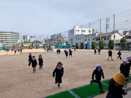 痺れるような冷たい風の中、外で元気よく遊んでいます。チャイムが鳴って靴箱まで駆け足で戻ってきます。学習が始まるまでに教室に戻ります。