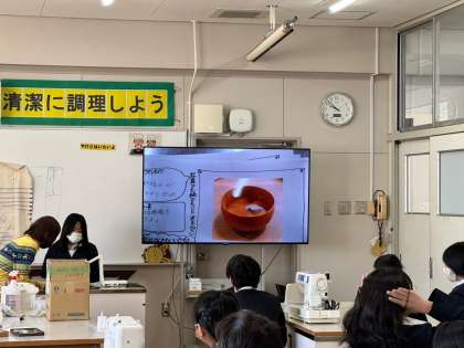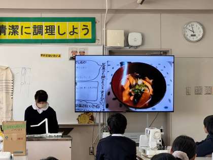 冬休みにおみそ汁を作った経験を、それぞれ発表している様子です。この発表を通して、おみそ汁は作る人によってさまざまな味や具材の組み合わせがあり、多様性があることを学べたと思います。にんじん、たまねぎ、豆腐、しいたけなど、発表に出てきた具材もさまざまで、きっと作る人の数だけおみそ汁の数があるのではないかと感じました。また、この経験をきっかけに、おみそ汁を大切な誰かのために作ってみてほしいと思います。