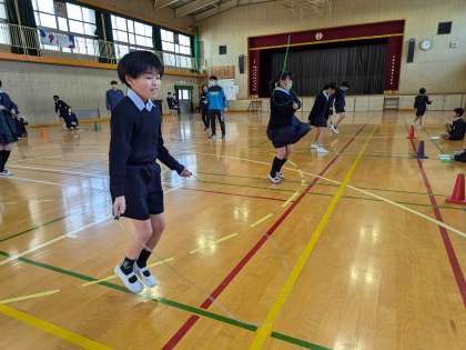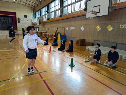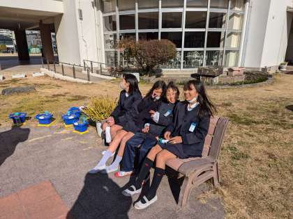 なわとび大会頑張りました。終わったあとに、中庭でホッと一息。温かい陽気に誘われて、ベンチで楽しく過ごしています。