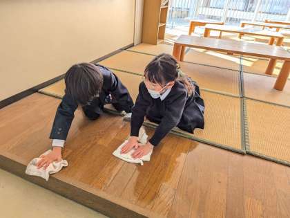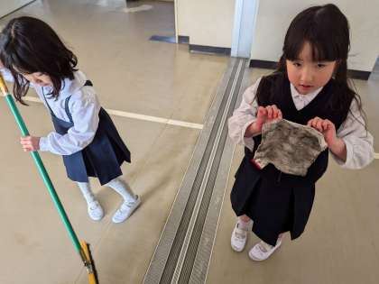 もくもく清掃で、ふれあい広場や廊下がピカピカになりました。汚れたぞうきんをもみ洗いして、ぞうきんの汚れを落とすところも頑張っています。