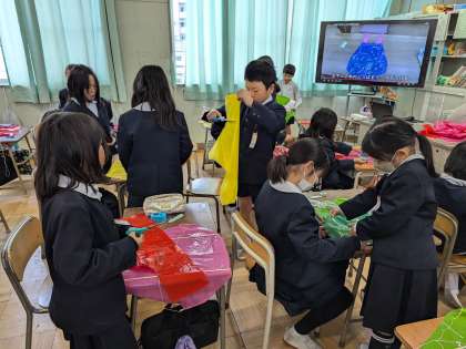 凧作りに挑戦しています。とてもカラフルな凧ができそうです。