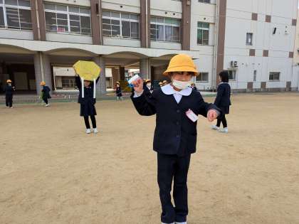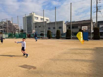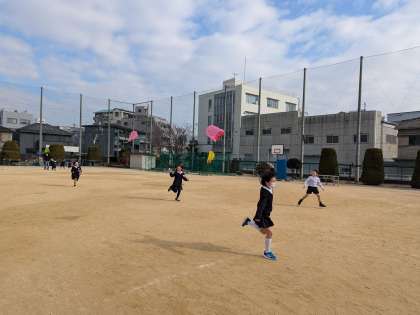 生活科の学習で作ったたこが完成しました。たこ糸を長くすることで、高く上がりました。