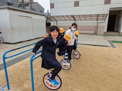 寒いですが、外で元気よく遊んでいます。実習生の皆さんも一緒に活動しています。