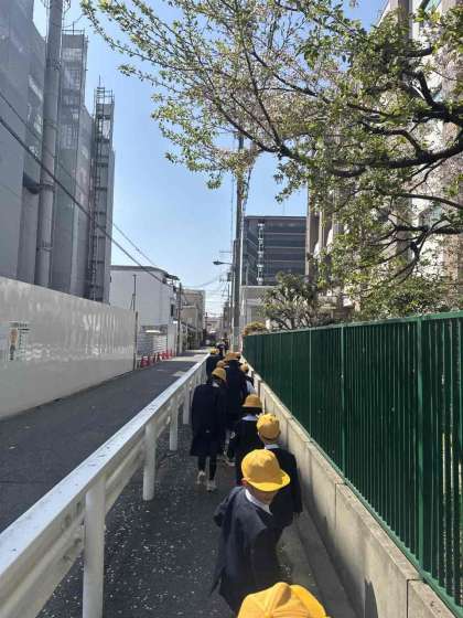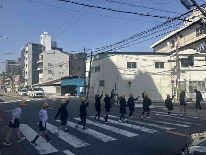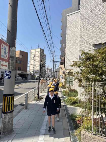 今日は交通安全指導として、校区内を歩きながら危険箇所の確認を行ったり横断歩道を渡る時の諸注意を聞いたりしました。