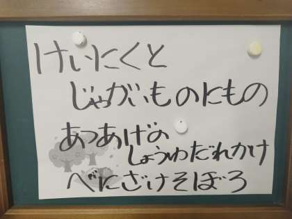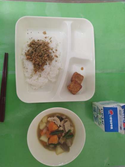 今日の給食は、ごはん、牛乳、鶏肉とじゃがいもの煮物、厚揚げのしょうゆだれかけ、紅ざけそぼろでした。