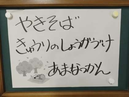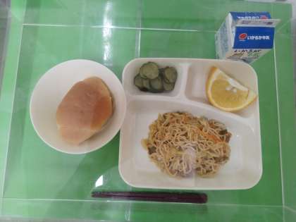 今日の給食は、ミニコッペパン、牛乳、やきそば、きゅうりのしょうがづけ、あまなつかんでした。