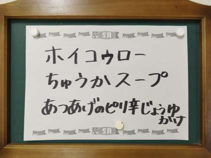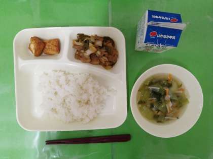 今日の給食は、ごはん、牛乳、ホイコウロー、中華スープ、厚揚げのピリ辛じょうゆかけでした。