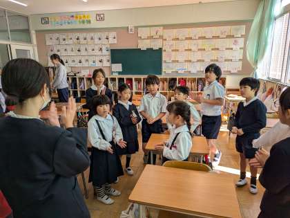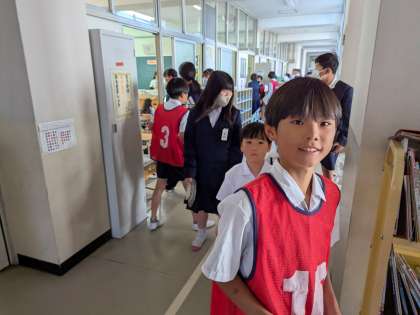 たてわり班を編成して初めての集会でした。今日は自己紹介をしています。1年生の送迎を6年生がしています。とても頼もしいです。