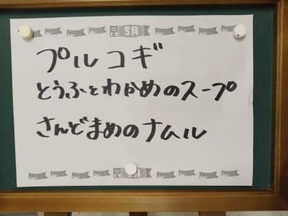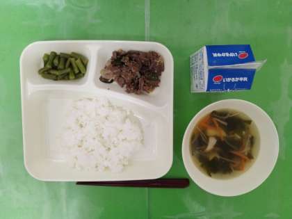 今日の給食はごはん、牛乳、プルコギ、豆腐とわかめのスープ、さんどまめのナムルです。