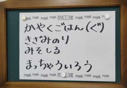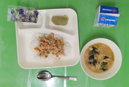 今日の給食は、かやくごはん、牛乳、みそ汁、抹茶ういろうです。