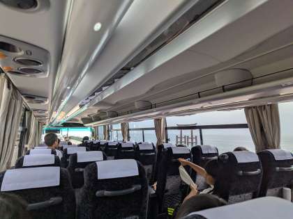 琵琶湖の鳥居を通過しました。天気はくもりです。バスレクはなぞなぞが始まりました。